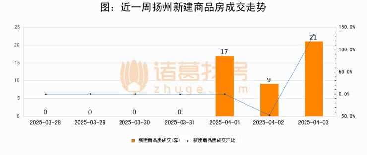 根据扬州市住房和城乡建设局数据显示,2025年04月03日扬州新建商品房成交21套,较昨日增加12套,环比上涨133.3%