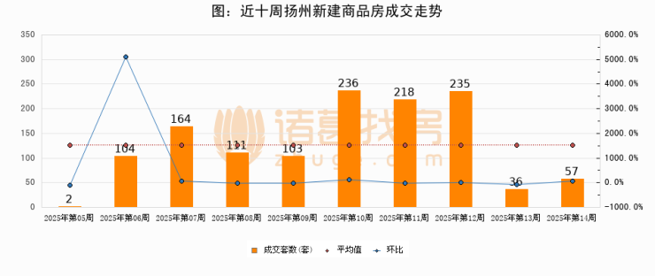 进入2025年第14周(03月31日-04月06日),扬州新建商品房成交57套,较上周增加21套,环比上涨58.3%