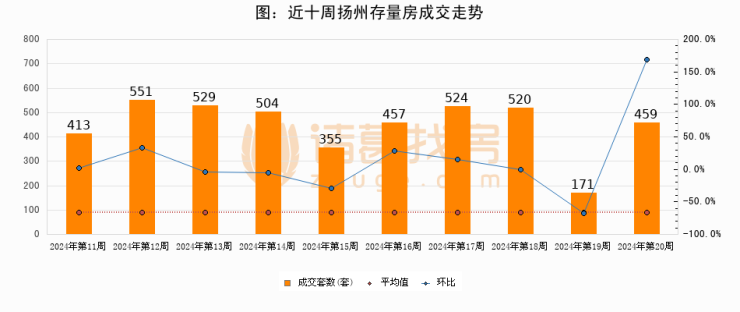 存量房方面,第19周扬州存量房成交459套,较上周增加288套,环比上涨168.4%。从近十周成交走势来看,周均成交套数为448套,本周高于平均水平2.5%。