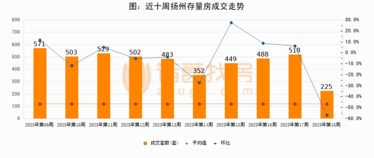 存量房方面,第18周扬州存量房成交225套,较上周减少293套,环比下降56.6%。从近十周成交走势来看,周均成交套数为462套,本周低于平均水平51.3%。