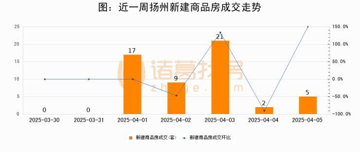 根据扬州市住房和城乡建设局数据显示,2025年04月05日扬州新建商品房成交5套,较昨日增加3套,环比上涨150%