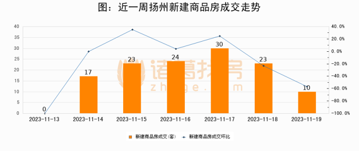 根据扬州市住房和城乡建设局数据显示,2023年11月19日扬州新建商品房成交10套,较昨日减少13套,环比下降56.5%
