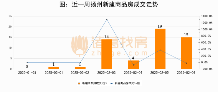 根据扬州市住房和城乡建设局数据显示,2025年02月06日扬州新建商品房成交15套,较昨日减少4套,环比下降21.1%。近一周扬州新建商品房日均成交8套。02月06日单日成交15套,高于近一周平均水平87.5%。