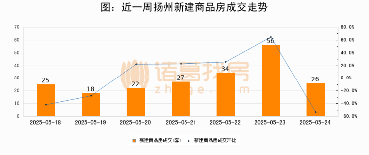 根据扬州市住房和城乡建设局数据显示,2025年05月24日扬州新建商品房成交26套,较昨日减少30套,环比下降53.6%