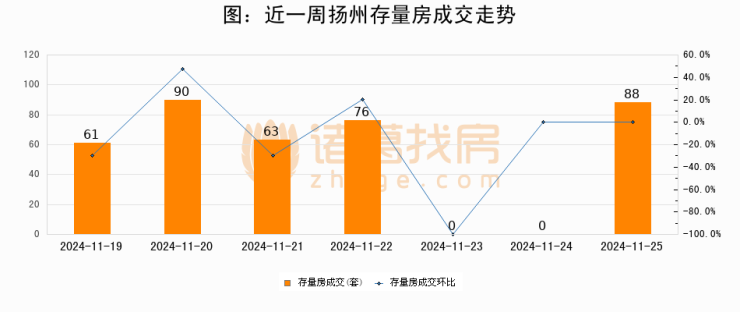 从存量房来看,2024年11月25日扬州存量房单日成交88套,比昨日增加88套,环比上涨0%。从近一周存量房成交来看,扬州存量房日均成交套数为54套,11月25日单日成交88套,高于近一周平均水平63%。