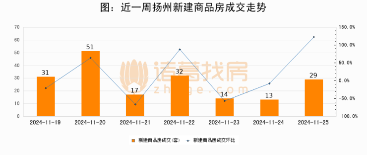 根据扬州市住房和城乡建设局数据显示,2024年11月25日扬州新建商品房成交29套,较昨日增加16套,环比上涨123.1%