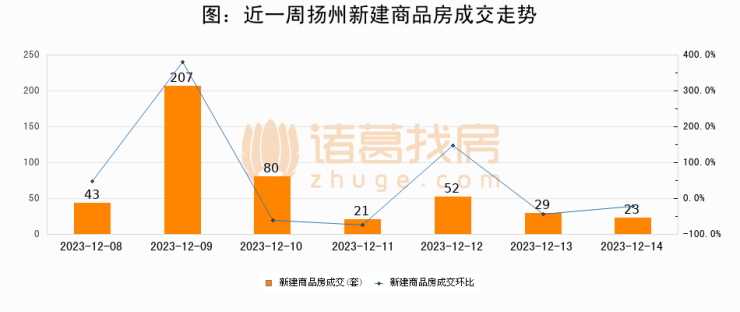根据扬州市住房和城乡建设局数据显示,2023年12月14日扬州新建商品房成交23套,较昨日减少6套,环比下降20.7%。近一周扬州新建商品房日均成交65套。12月14日单日成交23套,低于近一周平均水平64.6%。
