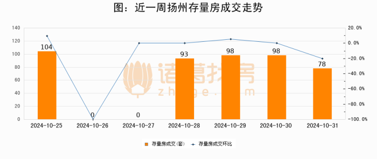 从存量房来看,2024年10月31日扬州存量房单日成交78套,比昨日减少20套,环比下降20.4%。从近一周存量房成交来看,扬州存量房日均成交套数为67套,10月31日单日成交78套,高于近一周平均水平16.4%。
