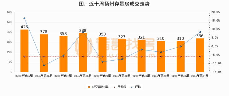 存量房方面,第34周扬州存量房成交336套,较上周增加26套,环比上涨8.4%。从近十周成交走势来看,周均成交套数为350套,本周低于平均水平4%。