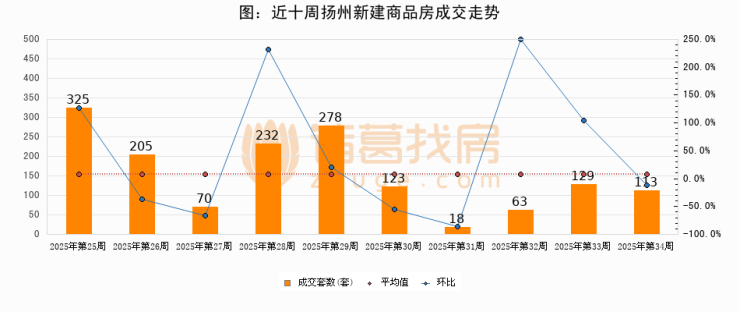 进入2025年第34周(08月18日-08月24日),扬州新建商品房成交113套,较上周减少16套,环比下降12.4%