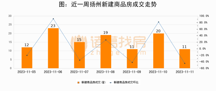 根据扬州市住房和城乡建设局数据显示,2023年11月11日扬州新建商品房成交11套,较昨日减少9套,环比下降45%