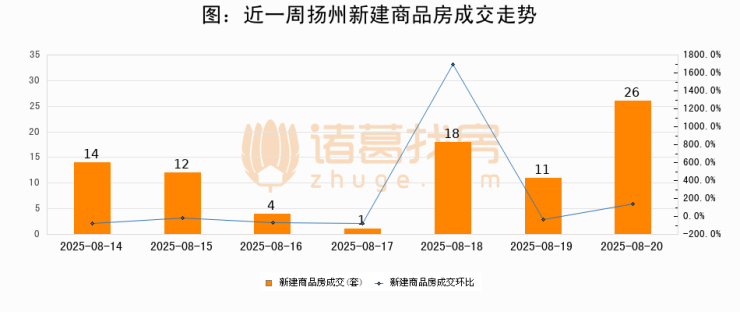 根据扬州市住房和城乡建设局数据显示,2025年08月20日扬州新建商品房成交26套,较昨日增加15套,环比上涨136.4%