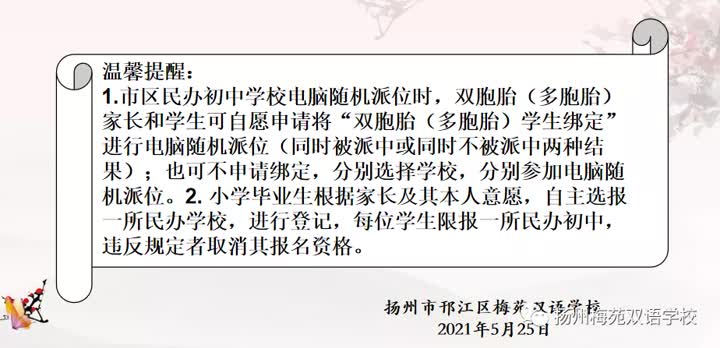 温馨提示:线下咨询时家长自愿携带各类证书原件,也可以不带。学校不超出扬州市教育局规定增设限制条件、拒绝或变相拒绝适龄儿童少年报名。