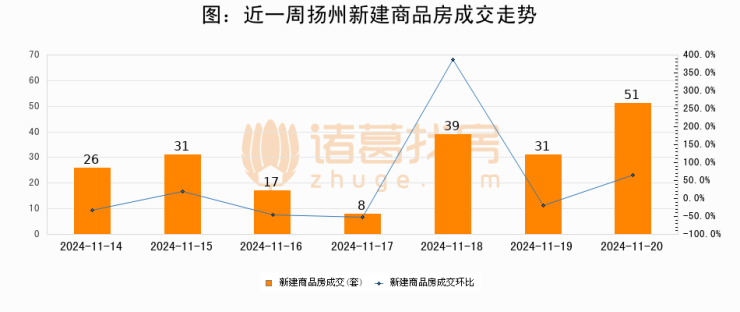 根据扬州市住房和城乡建设局数据显示,2024年11月20日扬州新建商品房成交51套,较昨日增加20套,环比上涨64.5%
