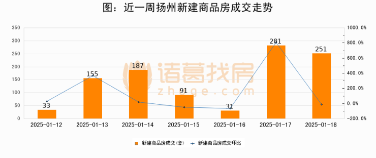 根据扬州市住房和城乡建设局数据显示,2025年01月18日扬州新建商品房成交251套,较昨日减少30套,环比下降10.7%