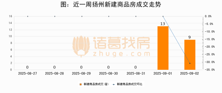 根据扬州市住房和城乡建设局数据显示,2025年09月02日扬州新建商品房成交9套,较昨日减少4套,环比下降30.8%