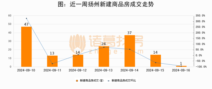 根据扬州市住房和城乡建设局数据显示,2024年09月16日扬州新建商品房成交1套,较昨日减少13套,环比下降92.9%