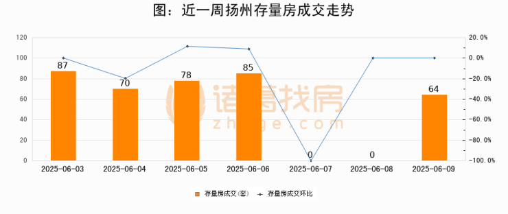 从存量房来看,2025年06月09日扬州存量房单日成交64套,比昨日增加64套,环比上涨0%。从近一周存量房成交来看,扬州存量房日均成交套数为54套,06月09日单日成交64套,高于近一周平均水平18.5%。