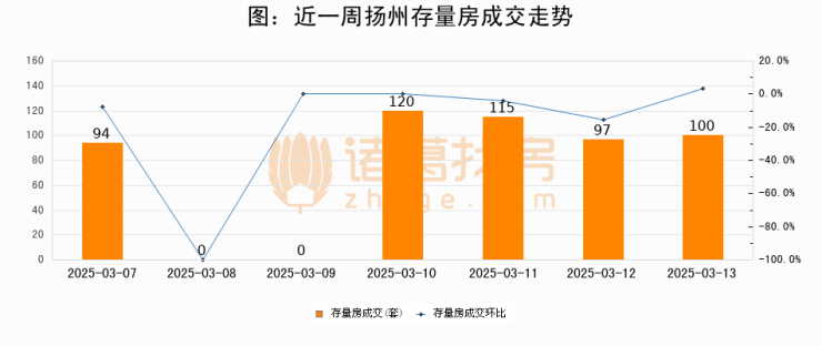 从存量房来看,2025年03月13日扬州存量房单日成交100套,比昨日增加3套,环比上涨3.1%。从近一周存量房成交来看,扬州存量房日均成交套数为75套,03月13日单日成交100套,高于近一周平均水平33.3%。