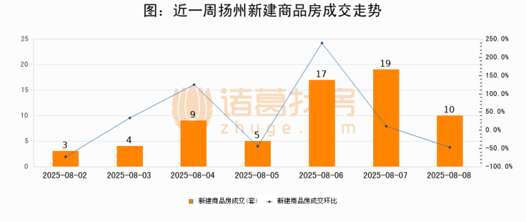 根据扬州市住房和城乡建设局数据显示,2025年08月08日扬州新建商品房成交10套,较昨日减少9套,环比下降47.4%