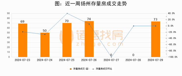 从存量房来看,2024年07月29日扬州存量房单日成交73套,比昨日增加73套,环比上涨0%。从近一周存量房成交来看,扬州存量房日均成交套数为48套,07月29日单日成交73套,高于近一周平均水平52.1%。