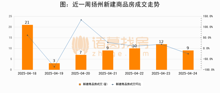 根据扬州市住房和城乡建设局数据显示,2025年04月24日扬州新建商品房成交9套,较昨日减少3套,环比下降25%