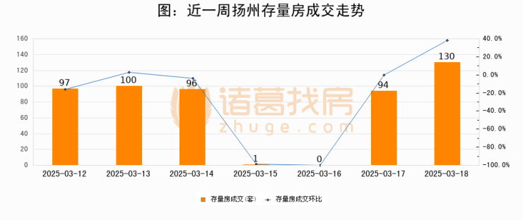 从存量房来看,2025年03月18日扬州存量房单日成交130套,比昨日增加36套,环比上涨38.3%。从近一周存量房成交来看,扬州存量房日均成交套数为74套,03月18日单日成交130套,高于近一周平均水平75.7%。