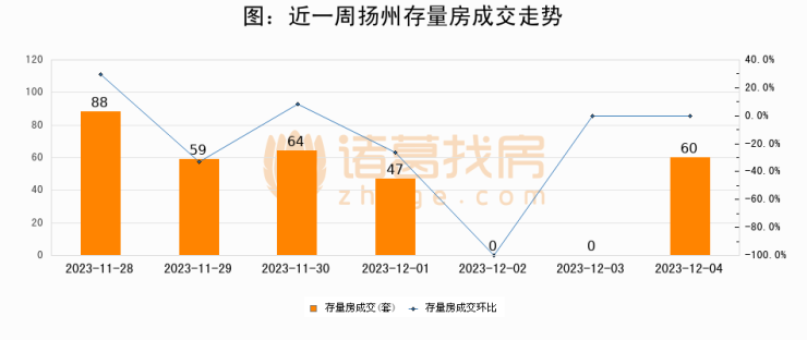 从存量房来看,2023年12月04日扬州存量房单日成交60套,比昨日增加60套,环比上涨0%。从近一周存量房成交来看,扬州存量房日均成交套数为45套,12月04日单日成交60套,高于近一周平均水平33.3%。