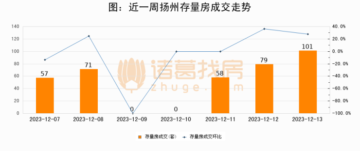 从存量房来看,2023年12月13日扬州存量房单日成交101套,比昨日增加22套,环比上涨27.9%。从近一周存量房成交来看,扬州存量房日均成交套数为52套,12月13日单日成交101套,高于近一周平均水平94.2%。