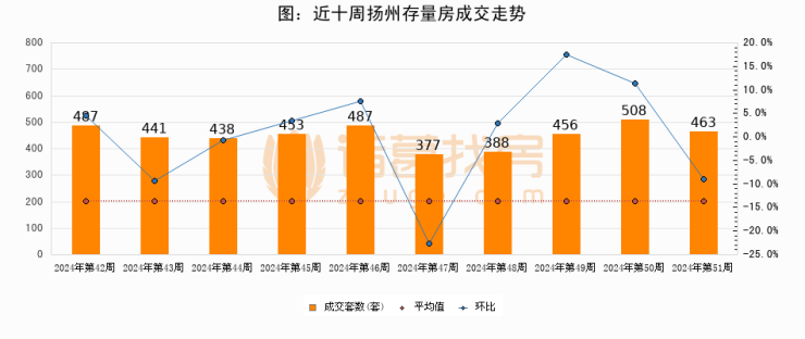 存量房方面,第52周扬州存量房成交463套,较上周减少45套,环比下降8.9%。从近十周成交走势来看,周均成交套数为449套,本周高于平均水平3.1%。