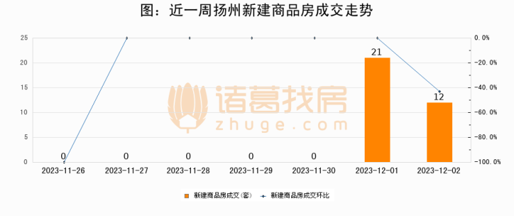 根据扬州市住房和城乡建设局数据显示,2023年12月02日扬州新建商品房成交12套,较昨日减少9套,环比下降42.9%