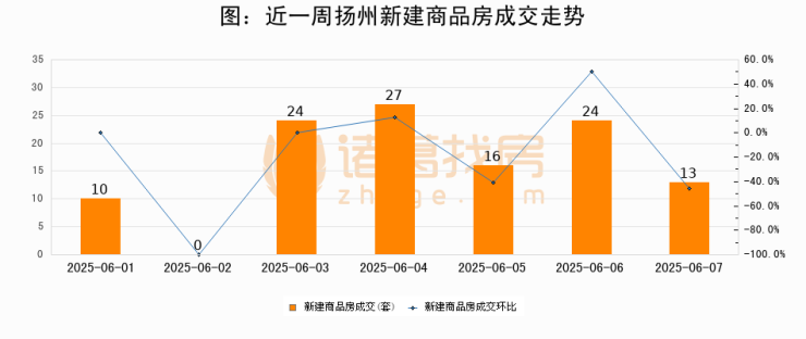 根据扬州市住房和城乡建设局数据显示,2025年06月07日扬州新建商品房成交13套,较昨日减少11套,环比下降45.8%