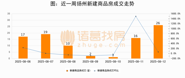 根据扬州市住房和城乡建设局数据显示,2025年08月12日扬州新建商品房成交26套,较昨日增加10套,环比上涨62.5%