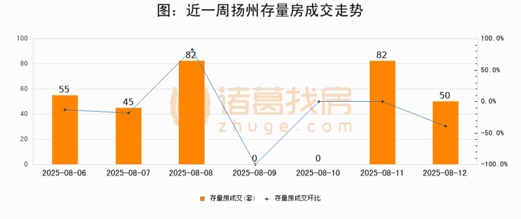 从存量房来看,2025年08月12日扬州存量房单日成交50套,比昨日减少32套,环比下降39%。从近一周存量房成交来看,扬州存量房日均成交套数为44套,08月12日单日成交50套,高于近一周平均水平13.6%。