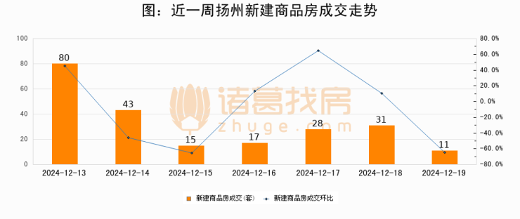 根据扬州市住房和城乡建设局数据显示,2024年12月19日扬州新建商品房成交11套,较昨日减少20套,环比下降64.5%