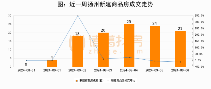 根据扬州市住房和城乡建设局数据显示,2024年09月06日扬州新建商品房成交21套,较昨日减少3套,环比下降12.5%