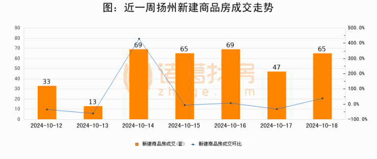 根据扬州市住房和城乡建设局数据显示,2024年10月18日扬州新建商品房成交65套,较昨日增加18套,环比上涨38.3%。近一周扬州新建商品房日均成交52套。10月18日单日成交65套,高于近一周平均水平25%。