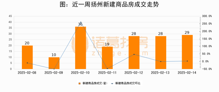 根据扬州市住房和城乡建设局数据显示,2025年02月14日扬州新建商品房成交29套,较昨日增加1套,环比上涨3.6%