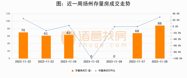 从存量房来看,2023年11月28日扬州存量房单日成交88套,比昨日增加20套,环比上涨29.4%。从近一周存量房成交来看,扬州存量房日均成交套数为50套,11月28日单日成交88套,高于近一周平均水平76%。