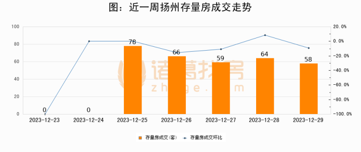 从存量房来看,2023年12月29日扬州存量房单日成交58套,比昨日减少6套,环比下降9.4%。从近一周存量房成交来看,扬州存量房日均成交套数为46套,12月29日单日成交58套,高于近一周平均水平26.1%。