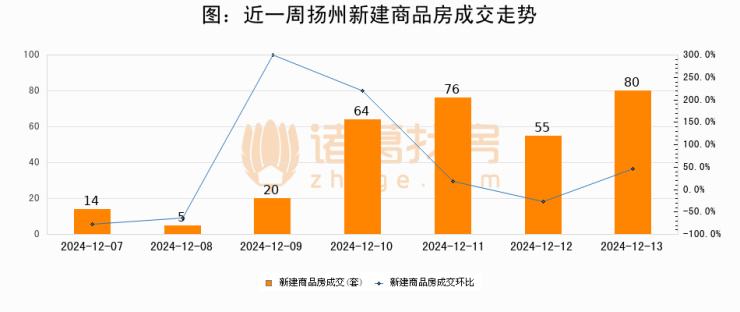 根据扬州市住房和城乡建设局数据显示,2024年12月13日扬州新建商品房成交80套,较昨日增加25套,环比上涨45.5%。近一周扬州新建商品房日均成交45套。12月13日单日成交80套,高于近一周平均水平77.8%。