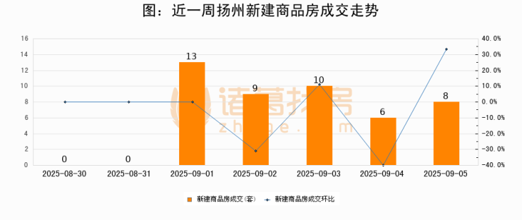 根据扬州市住房和城乡建设局数据显示,2025年09月05日扬州新建商品房成交8套,较昨日增加2套,环比上涨33.3%