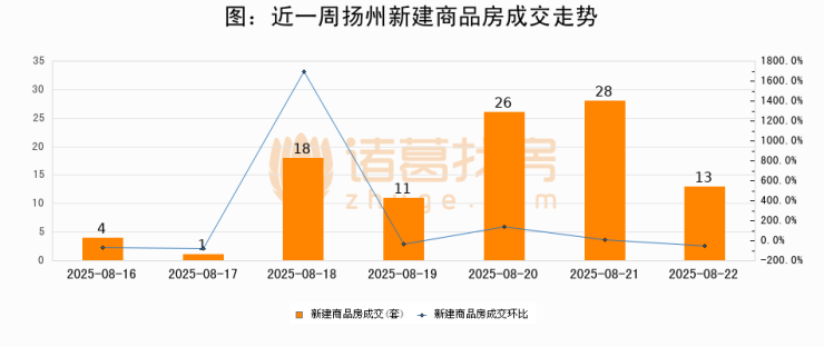 根据扬州市住房和城乡建设局数据显示,2025年08月22日扬州新建商品房成交13套,较昨日减少15套,环比下降53.6%