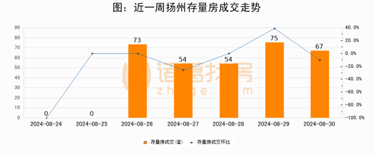从存量房来看,2024年08月30日扬州存量房单日成交67套,比昨日减少8套,环比下降10.7%。从近一周存量房成交来看,扬州存量房日均成交套数为46套,08月30日单日成交67套,高于近一周平均水平45.7%。