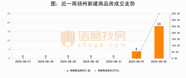 根据扬州市住房和城乡建设局数据显示,2024年09月02日扬州新建商品房成交18套,较昨日增加14套,环比上涨350%