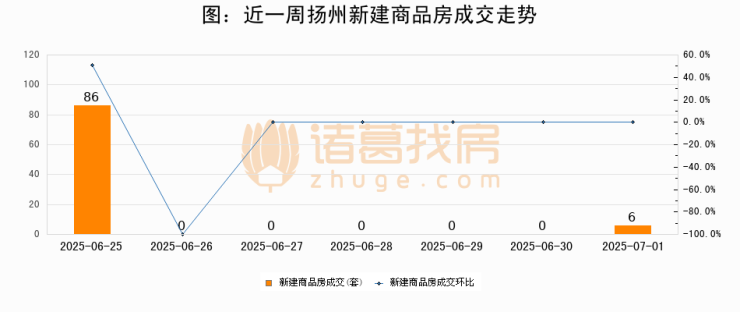 根据扬州市住房和城乡建设局数据显示,2025年07月01日扬州新建商品房成交6套,较昨日增加6套,环比上涨0%