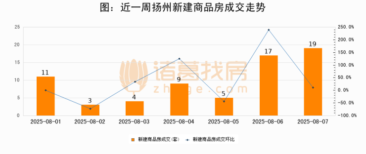根据扬州市住房和城乡建设局数据显示,2025年08月07日扬州新建商品房成交19套,较昨日增加2套,环比上涨11.8%