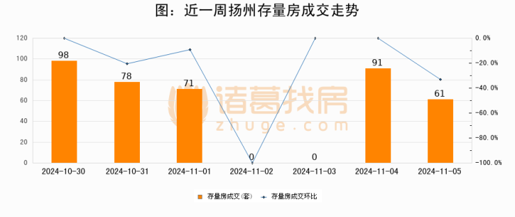 从存量房来看,2024年11月05日扬州存量房单日成交61套,比昨日减少30套,环比下降33%。从近一周存量房成交来看,扬州存量房日均成交套数为57套,11月05日单日成交61套,高于近一周平均水平7%。