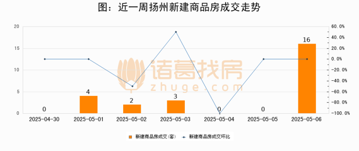 根据扬州市住房和城乡建设局数据显示,2025年05月06日扬州新建商品房成交16套,较昨日增加16套,环比上涨0%