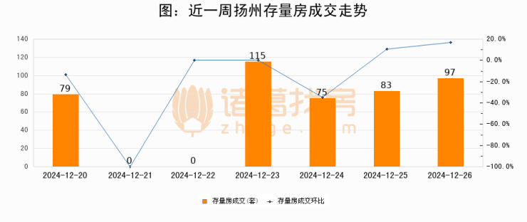 从存量房来看,2024年12月26日扬州存量房单日成交97套,比昨日增加14套,环比上涨16.9%。从近一周存量房成交来看,扬州存量房日均成交套数为64套,12月26日单日成交97套,高于近一周平均水平51.6%。